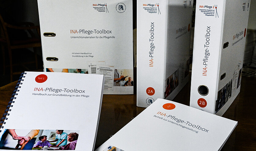 Die Fülle an erstellten Lehr- und Lernmaterialien machte es notwendig, die Arbeitsblätter auf zwei DIN A4-Ordner aufzuteilen: Die INA-Pflege-Toolbox 2A und 2B. Darüber hinaus wurde ein Beiheft zur Unterrichtsgestaltung erstellt mit Sensibilisierungs- und Weiterbildungsinformationen u. a. zu den Themen Operatoren, Selbsteinschätzung/Reflexion, Aktions- und Sozialformen, Unterrichtsmethoden, Tafelbild sowie Einfacher und Leichter Sprache.